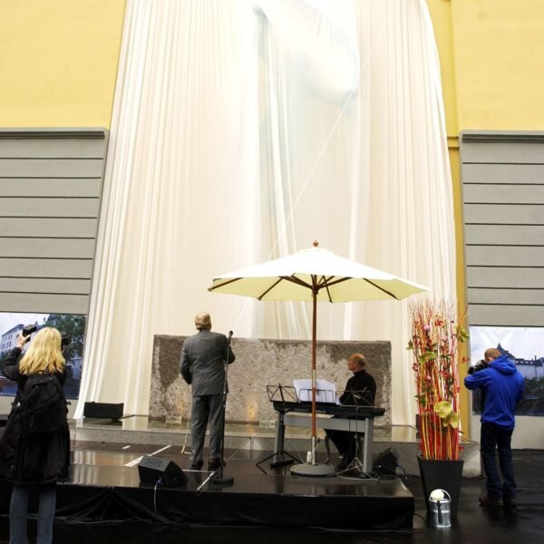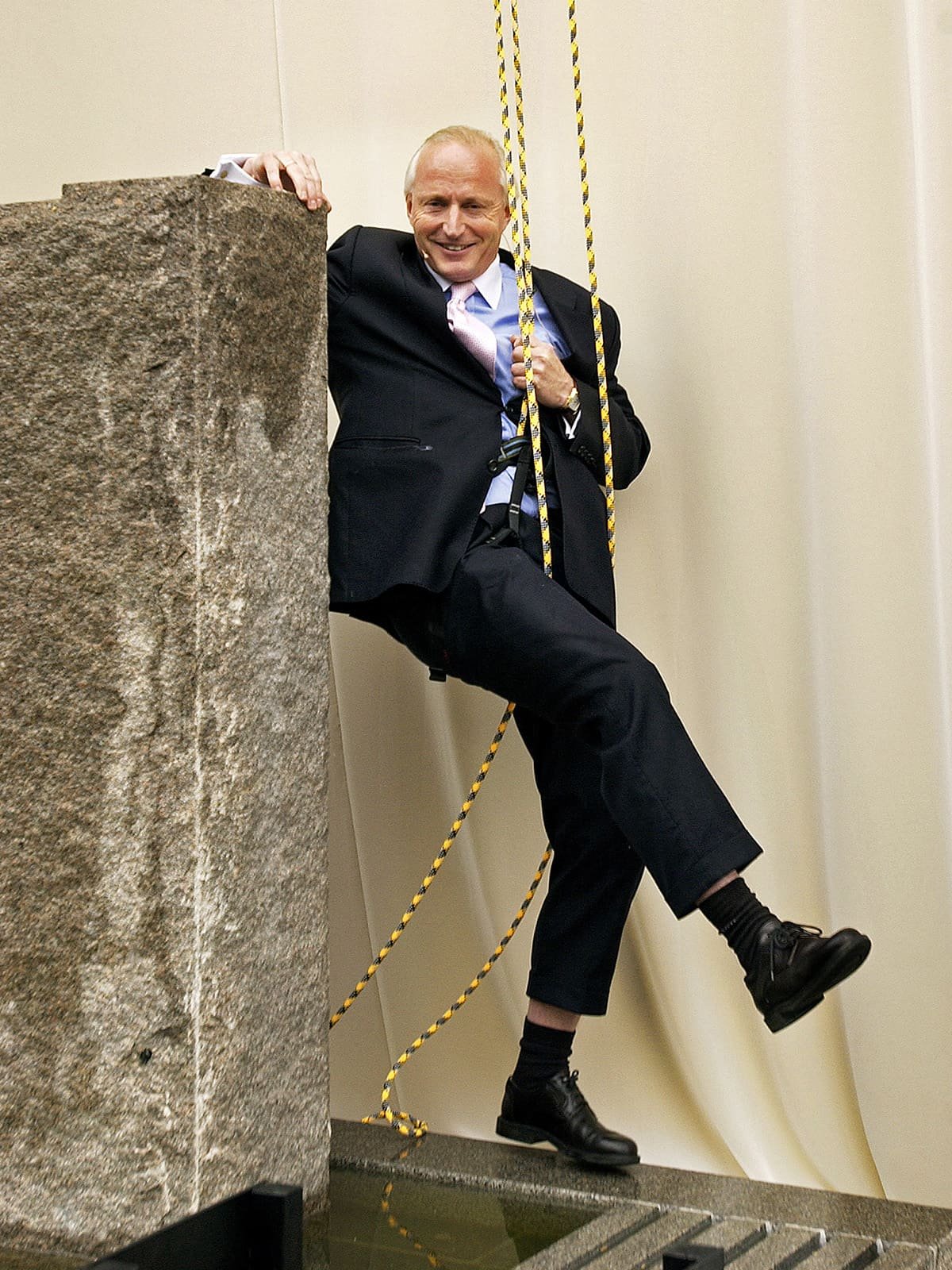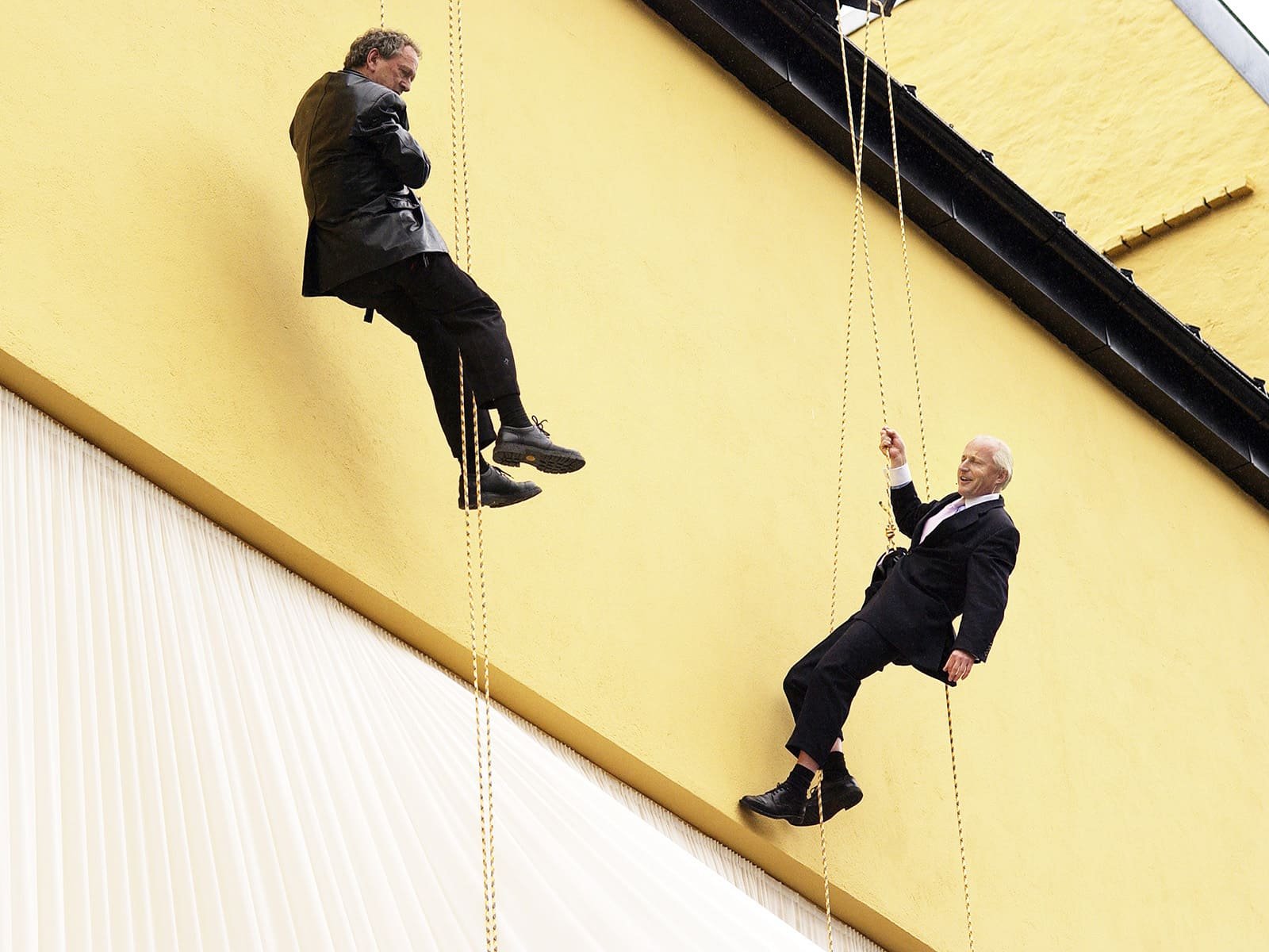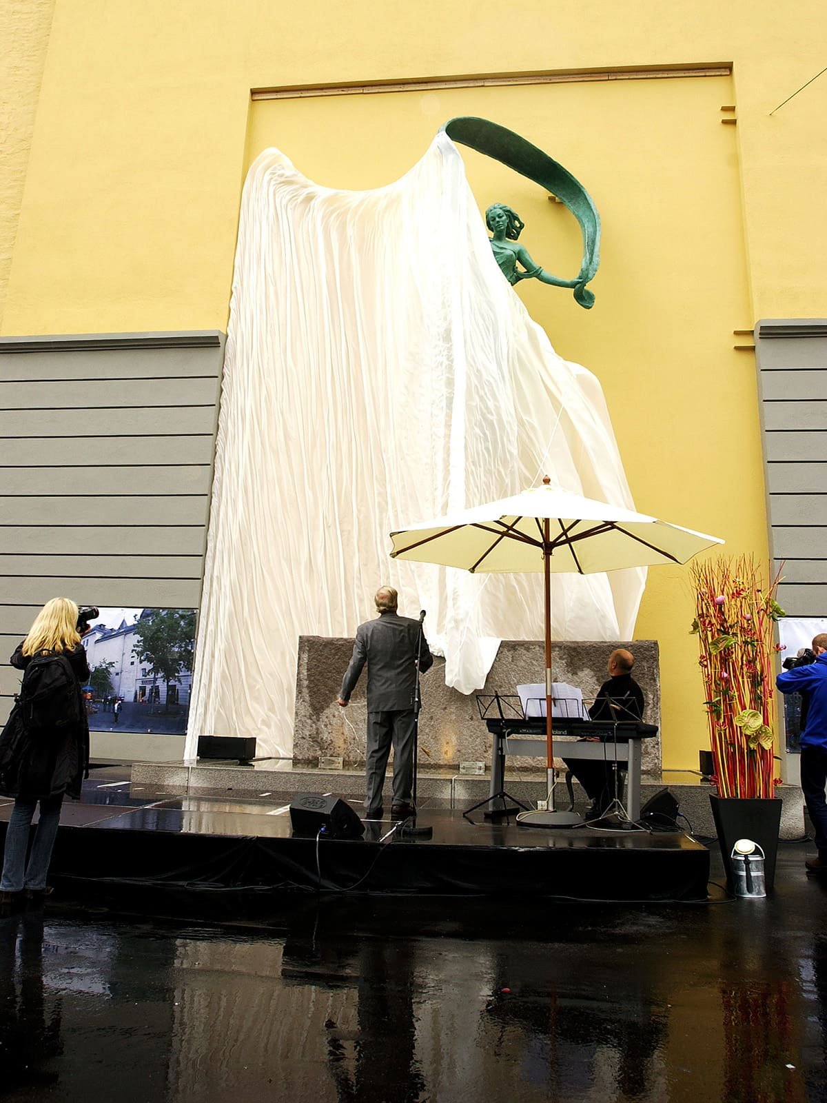 Det var ingen tradisjonell snorklipping inviterte gjester fikk overvære denne regntunge og kjølige junidagen. Seansen startet, spektakulært nok, med profesjonelle utøvere dansende nedover husveggen der Fru Fortuna er montert. Men da gjestene fikk se to svartkledde herrer rappellere nedover bygget gikk det et sus gjennom forsamlingen. For hvem kom der – jo Christian Ringnes og Per Ung!