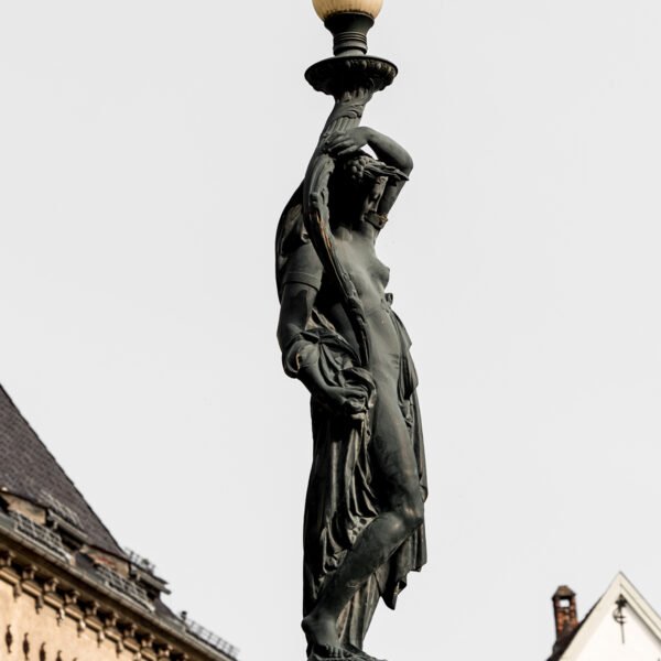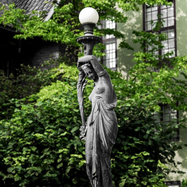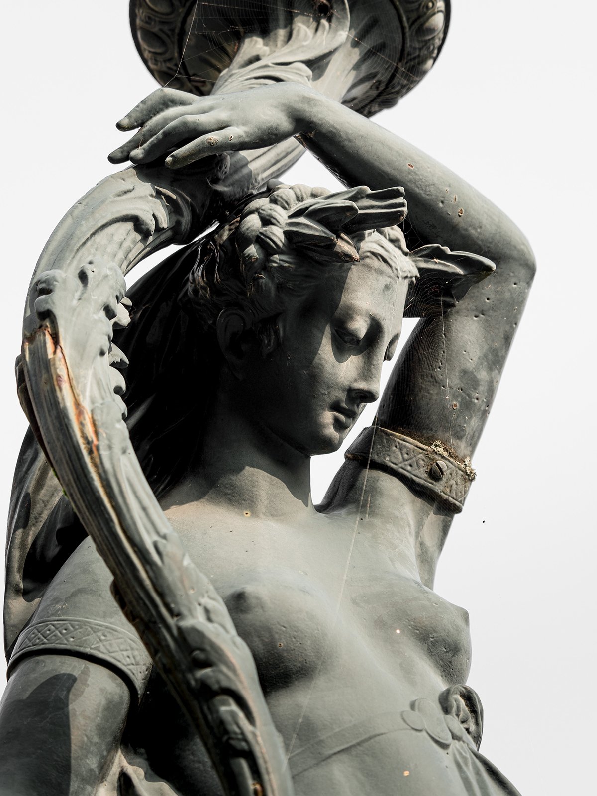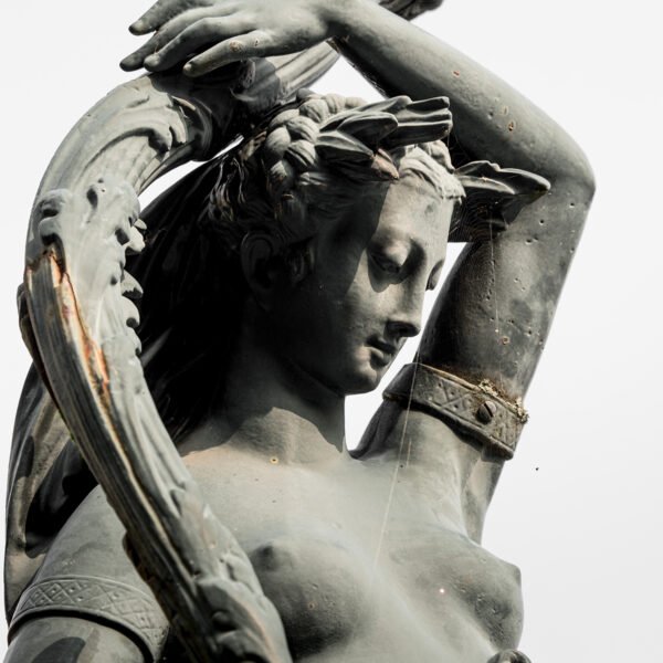 Fontenen er sammensatt av enkelte ledd som hver for seg finnes i firmaets katalog fra 1870-årene. De forskjellige elementene kunne kombineres nokså fritt innbyrdes. Vi har et katalogblad som viser kvinnefiguren i fire forskjellige utførelser – som lykteholder med overflødighetshorn eller som fontene med vannsprutende konkylie, eller speilvendte versjoner av begge. Katalogen har også en illustrasjon som viser figuren på en helt annen sokkel og med et annet basseng.