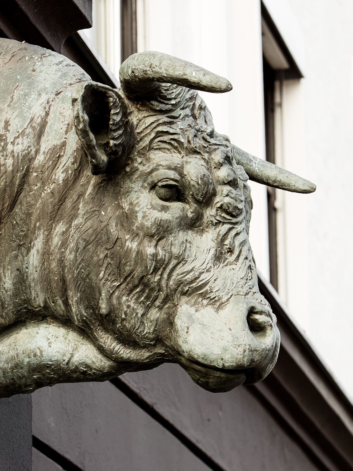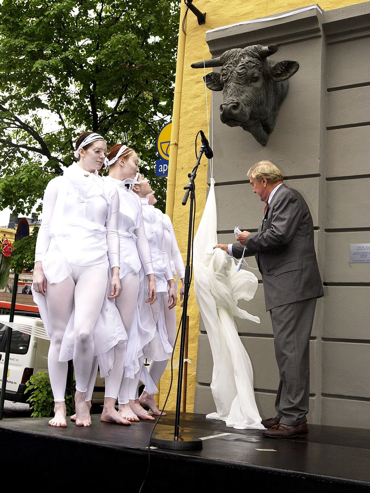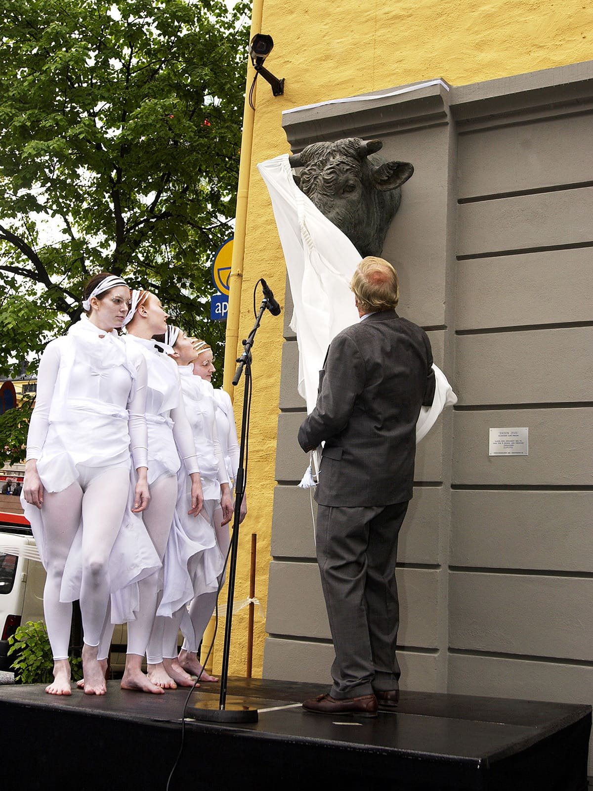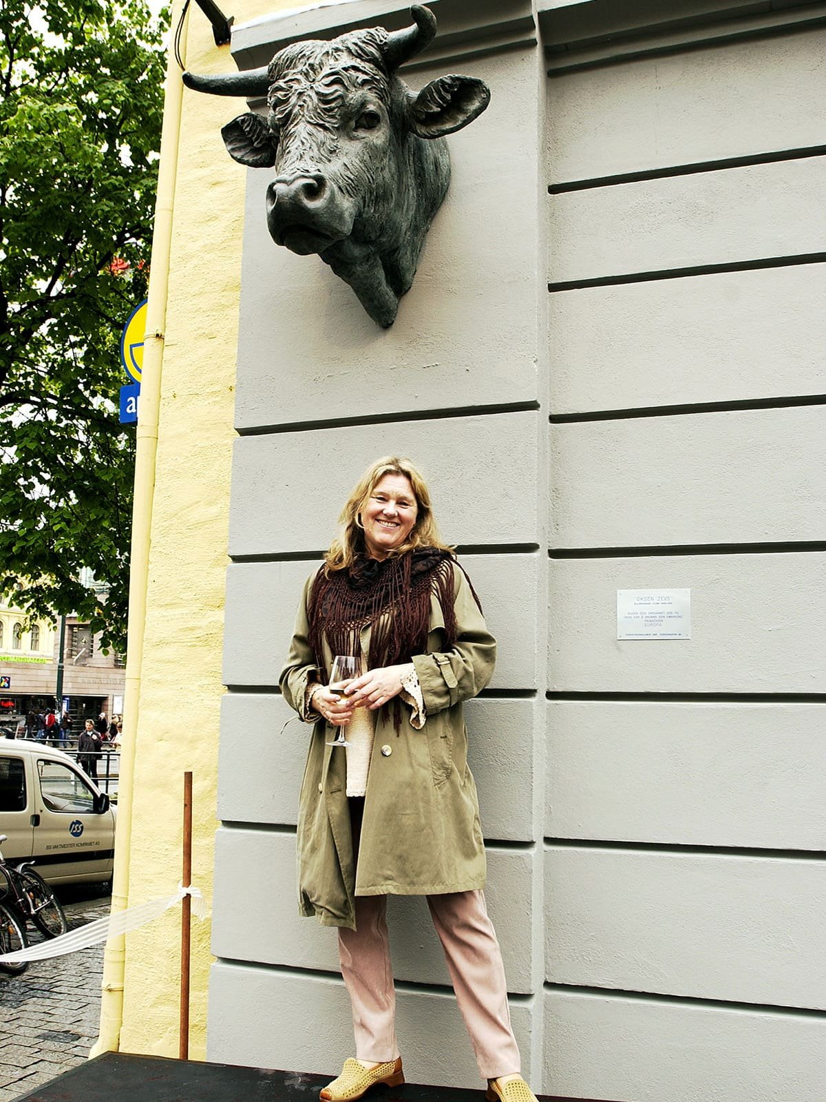 Oksehodet er laget av Elena Engelsen og ble avduket 3. juni 2005, samme dag som Fru Fortuna. Det var ordføreren, Per Ditlev-Simonsen som dro av «sløret», og forsamlingen lot seg begeistre. Og selv om det gode sommerværet i juni glimret med sitt fravær, var det en upåklagelig stemning på Europarådets plass denne fredag ettermiddag.