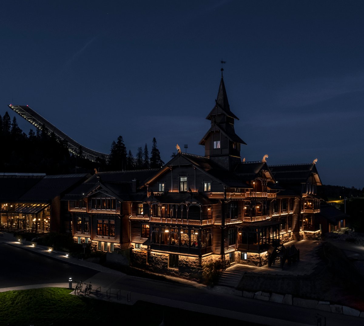 Det historiske og vakre Dragebygget på Scandic Holmenkollen Park Hotel har vunnet Norsk Lyspris 2023 for beste utendørsprosjekt. Belysningen er designet av Halvor Næss og utført av Torshov Elektro AS.