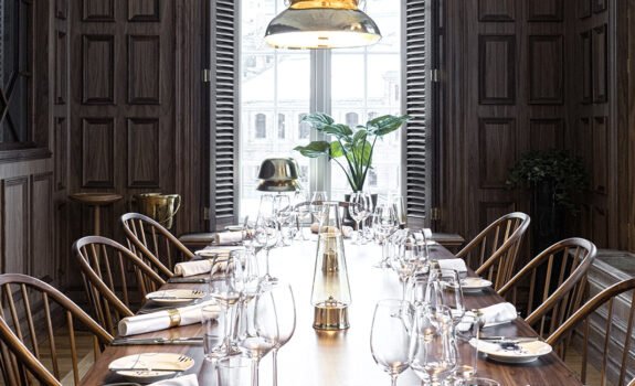 De hvitmalte veggene og den tropiske palmen bidrar til rommets letthet og eleganse. Med forbedret akustikk, fremstår Nedre Foss Gård som en historisk perle og en vakker storstue på Oslos østkant. For mer informasjon om Nedre Foss Gård, besøk deres hjemmeside: https://www.nedrefossgaard.no/