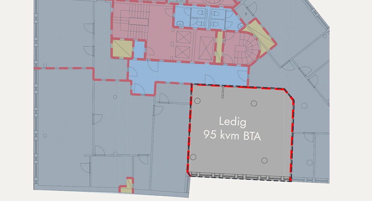 Arealet på 95 kvadratmeter BTA har en enkel standard og består av ett stort rom med kjøkken, og kan egne seg for kontorplasser med åpen løsning.