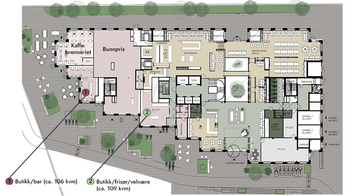 - Butikk/servering – ca. 284 kvm BTA